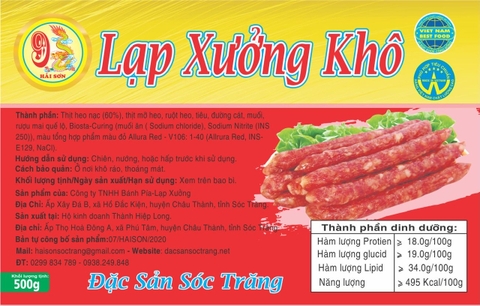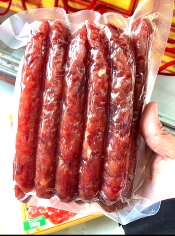 Thành phần: Thịt heo nạc (60%), thịt mỡ heo, ruột heo, tiêu, đường trắng đồn điền loại A1, muối Iod, rượu, mai quế lộ,chất bảo quản Potassium Sobate(202),phẩm màu đỏ Allura Red - V106: 41-80 (129).